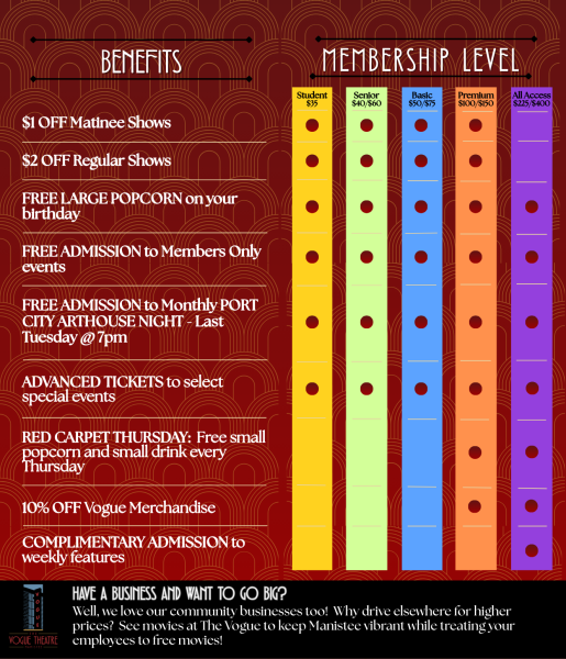Vogue members are the lifeline of sustainability for our special programs and offerings, allowing us to provide quality, affordable, entertaining, and educational cinema events year-round.